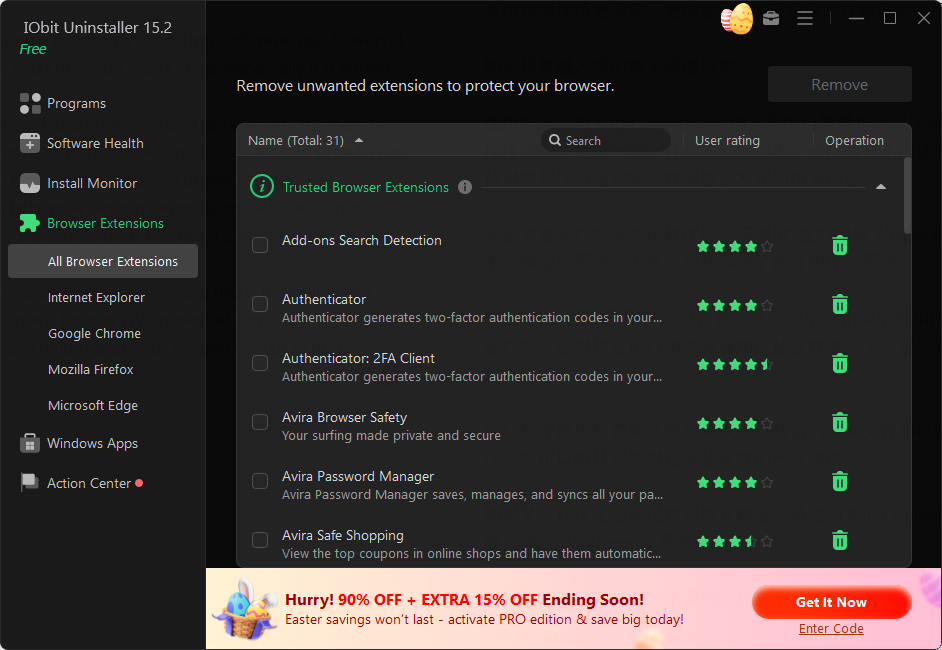IObit Uninstaller removes browser plug-ins and toolbars to help protect your privacy. It uses a large database to spot more unwanted or harmful extensions in Chrome, Firefox, Edge, and Internet Explorer. This way, you can see what you installed and what was added without your knowledge.