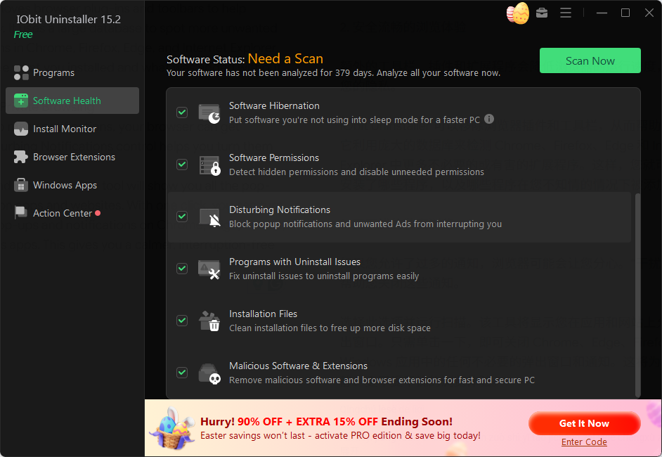 It doesn’t just uninstall apps. IObit Uninstaller also scans for leftover programs, folders, registry entries, and more, then lists them all in one place so you can clean them up with a few clicks. It also helps your browser run smoothly and blocks annoying notifications that might interrupt your work.